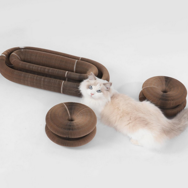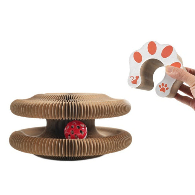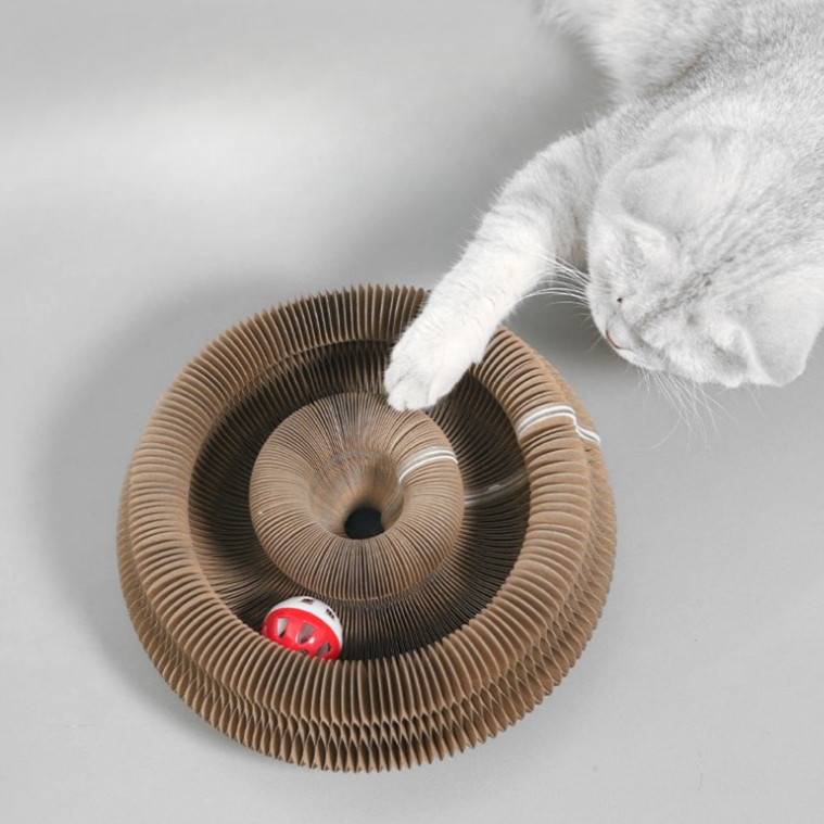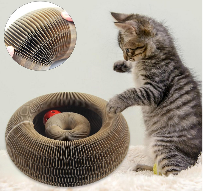 Das Spielzeug besteht aus einer spiralförmigen Bahn aus flexiblem Material. In ihr rollt ein Ball frei hin und her, sobald die Katze ihn anstupst. Die Form verhindert, dass der Ball herausfällt, bleibt aber dauerhaft in Bewegung – je nach Stärke des Stoßes mal langsam, mal blitzschnell.
